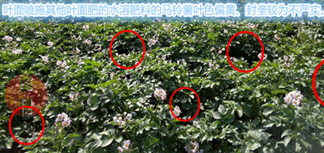 2015年7月24日觀察,發現葉面噴施皓達水溶肥料的馬鈴薯葉片展開度較好、封壟嚴實整齊;而對照的葉片則較薄。