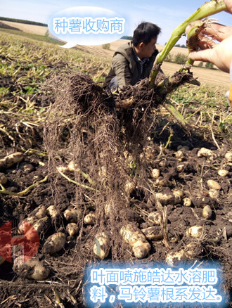2015年9月初馬鈴薯收獲測產:先收獲的是其他葉面肥噴施的馬鈴薯,皓達水溶肥料噴施的最后收獲的,當起馬鈴薯的機器起過皓達噴施的地塊時,孟老板特別激動的對我們說,這塊地的產量肯定比那一塊的產量高,大概估算就能高出一千斤左右。因為噴施皓達的馬鈴薯個頭大、均勻、個數也多,二次生長的現象很少;噴施其他葉面肥的馬鈴薯個頭較小、二次生長嚴重。收獲那天一起去的還有一位山東的馬鈴薯種薯收購商,他也說這塊地的馬鈴薯產量高、長的好,希望能和孟老板定下這塊地的種薯。并且這位收購商還發現:使用皓達水溶肥料的馬鈴薯根系特別發達。