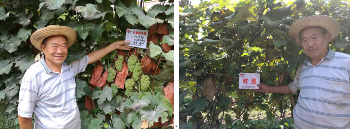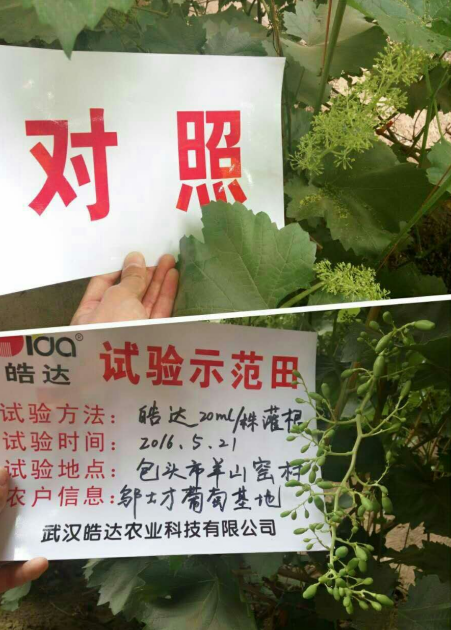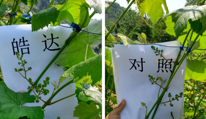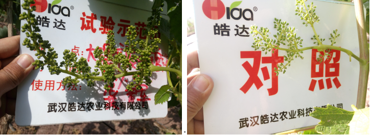 施肥時期:5月 花穗拉長 時期問題: 營養供給失調,缺乏性元素,花穗不長。 施肥方案:(每壺30斤水) 葉噴:皓達功能肥500倍(30mL/30斤水)+皓達硼800倍(20mL/30斤水)+調節劑 施肥效果: 花穗拉長效果明顯,葡萄花穗漂亮。