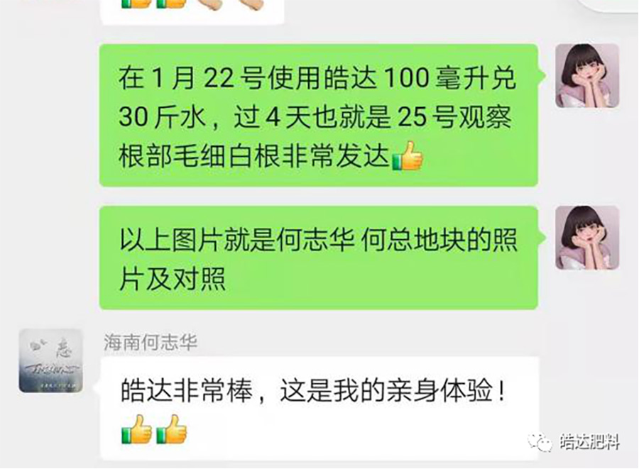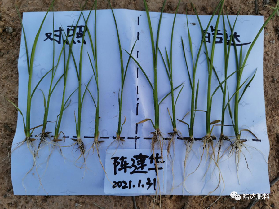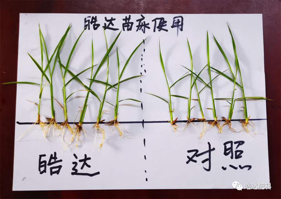 上圖是陳棟陳總和陳建華陳總的秧苗,根系好、長(zhǎng)勢(shì)壯、顏色正,移栽后根系能快速與土壤親和,有助于移栽后的緩苗和返青。他們的育種秧田怎么培育出這樣根多苗壯葉綠的秧苗呢?實(shí)際也不難,其中關(guān)鍵的一步就是用對(duì)皓達(dá),在秧苗兩葉一心時(shí),用皓達(dá)100毫升兌水30公斤進(jìn)行噴施。(建議大家預(yù)留一小塊地不用,留做對(duì)比。)好的秧苗是高產(chǎn)的第一步,今天小編也為各位老板準(zhǔn)備了高產(chǎn)的第二步,一起來(lái)看看吧……