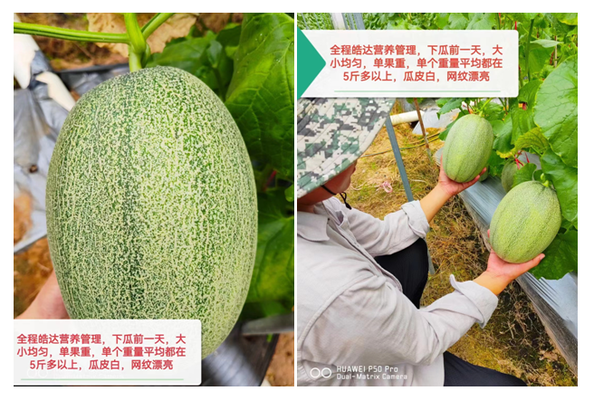 哈密瓜施用皓達,控旺一絕,葉片小而厚綠;莖桿粗壯節間距離短,皓達配施肥效足,膨瓜快而整齊,增甜著色瓜皮靚。