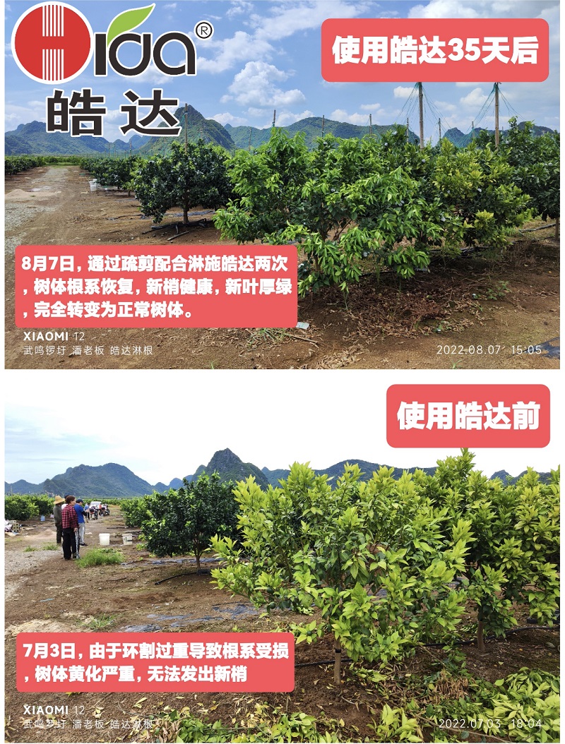 我們?cè)趶V西、廣東、贛州、湖北、黑龍江、內(nèi)蒙等多地的多種果樹(shù)上進(jìn)行了大量大田示范,通過(guò)應(yīng)用皓達(dá)微生物次生代謝物,果樹(shù)可在短時(shí)間內(nèi)快速恢復(fù)生長(zhǎng),表現(xiàn)為根系快速生長(zhǎng),白根毛根面積快速擴(kuò)大,吸收營(yíng)養(yǎng)能力增強(qiáng),果樹(shù)的葉片快速轉(zhuǎn)綠增厚,果樹(shù)的抗逆性明顯提高,病蟲(chóng)害的發(fā)生也明顯減少。此外,該技術(shù)還可以改善果實(shí)的品質(zhì),讓果實(shí)膨大快,果皮細(xì)膩,水份充足,香甜可口,轉(zhuǎn)色快,果色正,提高了果實(shí)的商品價(jià)值。這一技術(shù)在果樹(shù)恢復(fù)方面的應(yīng)用,將為果樹(shù)產(chǎn)業(yè)的發(fā)展帶來(lái)新的機(jī)遇和挑戰(zhàn)。