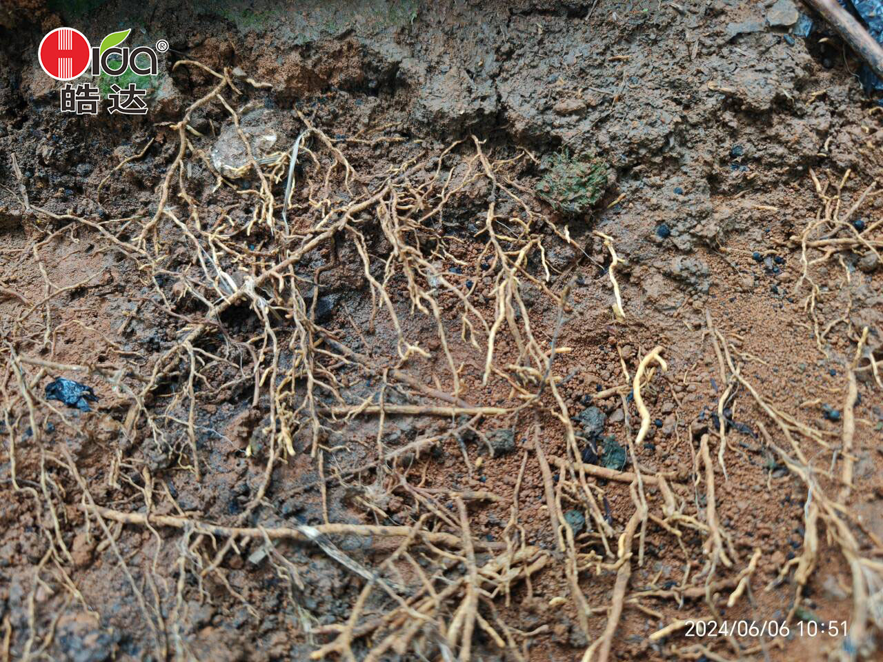 大雨過后的皓達果園有些果樹根表層土被沖刷掉,部分根系暴露出來,淋施過皓達的果樹根系非常發達、毛細根多,吸收土壤養分能力強大,果實膨大快。