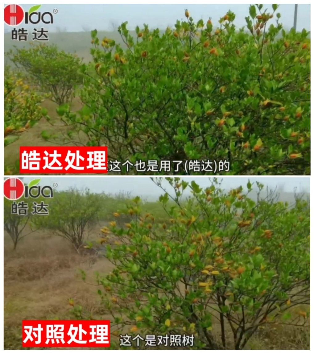 1、使用皓達的水梔子樹(皓達處理)葉片厚綠茂盛、掛果多、樹勢健壯;未使用皓達的水梔子樹(對照處理)葉片淡綠 稀少、掛果少、樹勢瘦弱(圖1)。