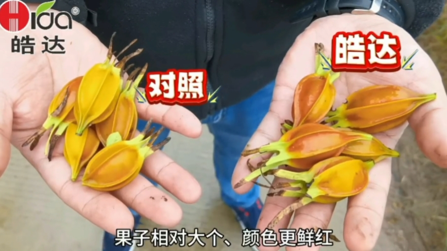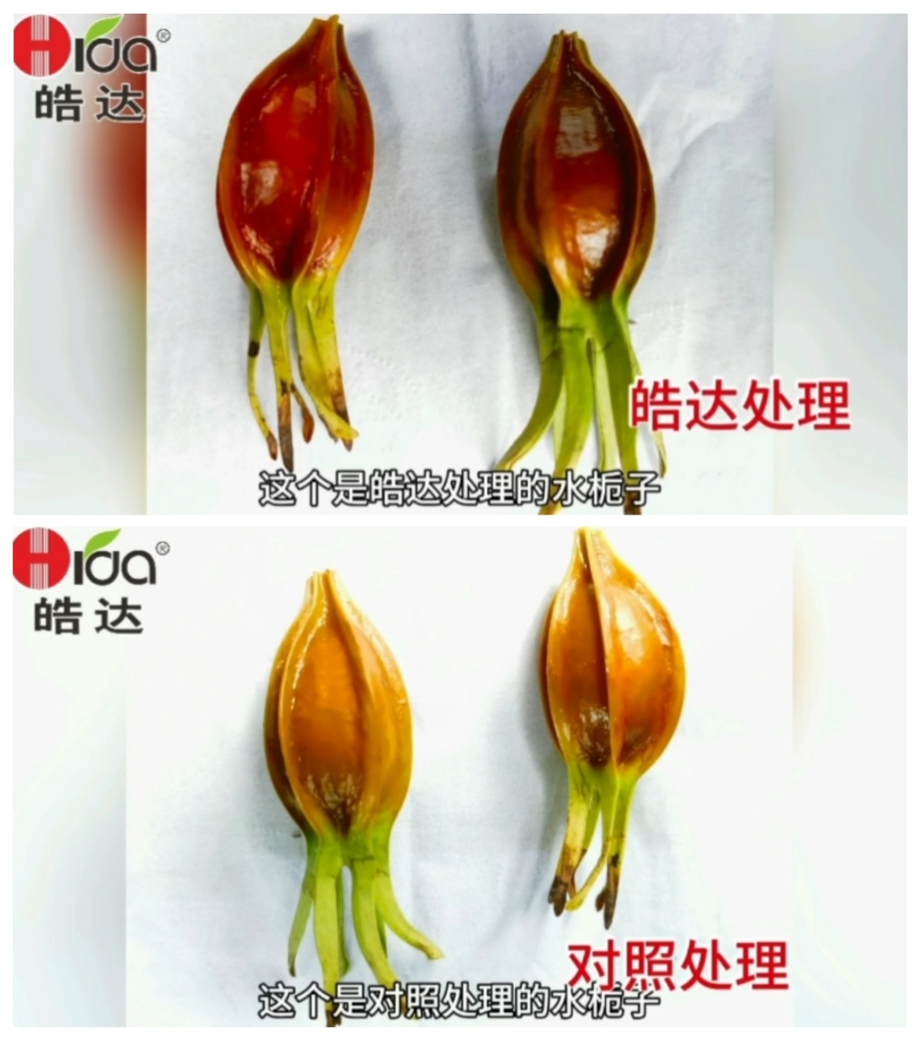 2、左為對照處理水梔子果實,右為皓達處理水梔子果實。