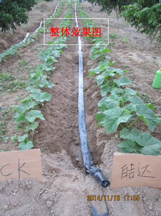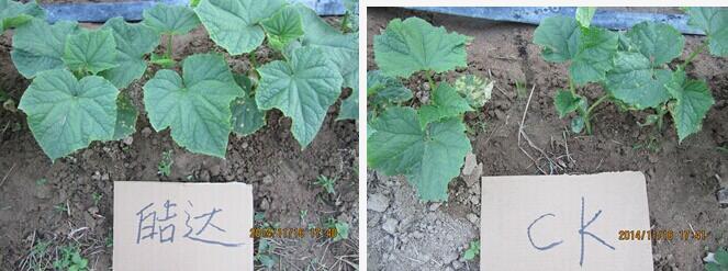 2014年11月16日觀察:該青瓜地出現病害,施用“皓達有機水溶肥”的青瓜苗長勢旺盛,受病害的影響較小;對照的影響較大。