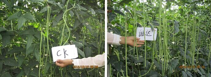 三亞市崖城鎮黎師傅家,從2014年11月28日至2014年12月9日期間共用“皓達有機水溶肥”淋根兩次。2014年12月12日觀察,對照的豇豆結果率低,施用“皓達有機水溶肥”的豇豆結果率高,豇豆又直又長,賣相好。