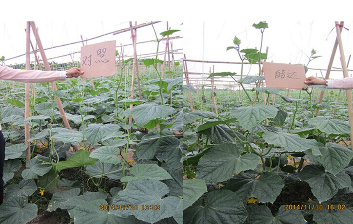 2014年11月20觀察:施用“皓達有機水溶肥”的青瓜苗葉片厚綠、寬大。對照葉片小、發黃。