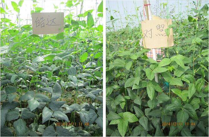 2014年12月7日,三亞市南濱農場十一連劉師傅家,“皓達有機水溶肥”稀釋1000倍葉面噴施,2014年12月11日觀察,豇豆整體長勢好,光合作用旺盛,葉片厚綠、植株健壯;對照莖稈纖細、葉片發黃。