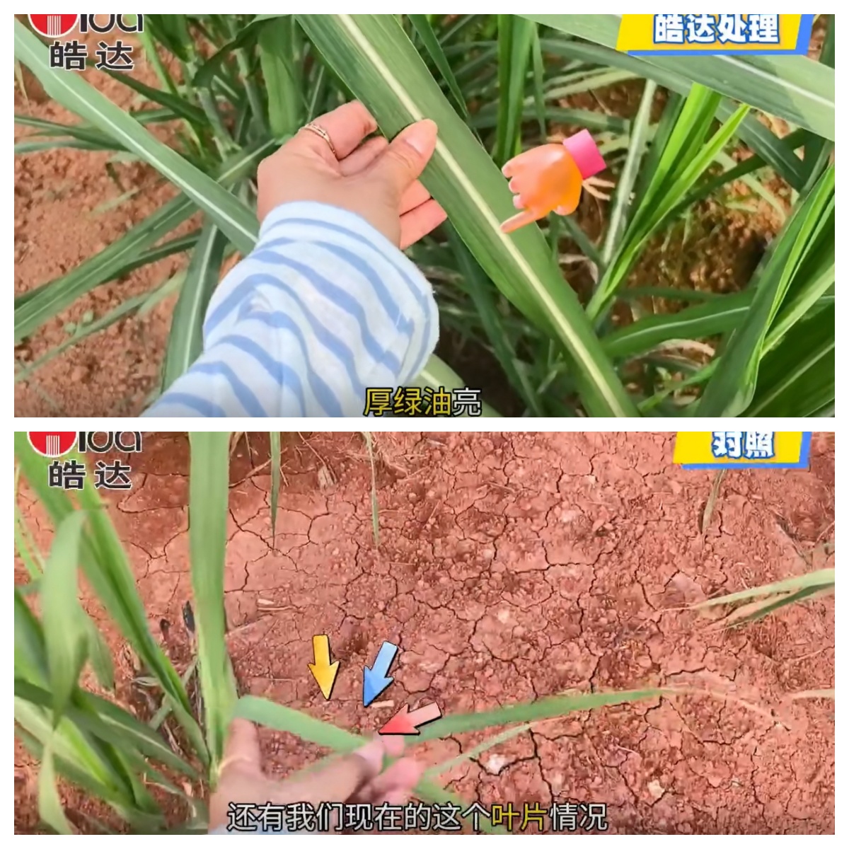 1.皓達處理的甘蔗葉片厚綠油亮;對照的甘蔗葉片瘦弱偏黃。