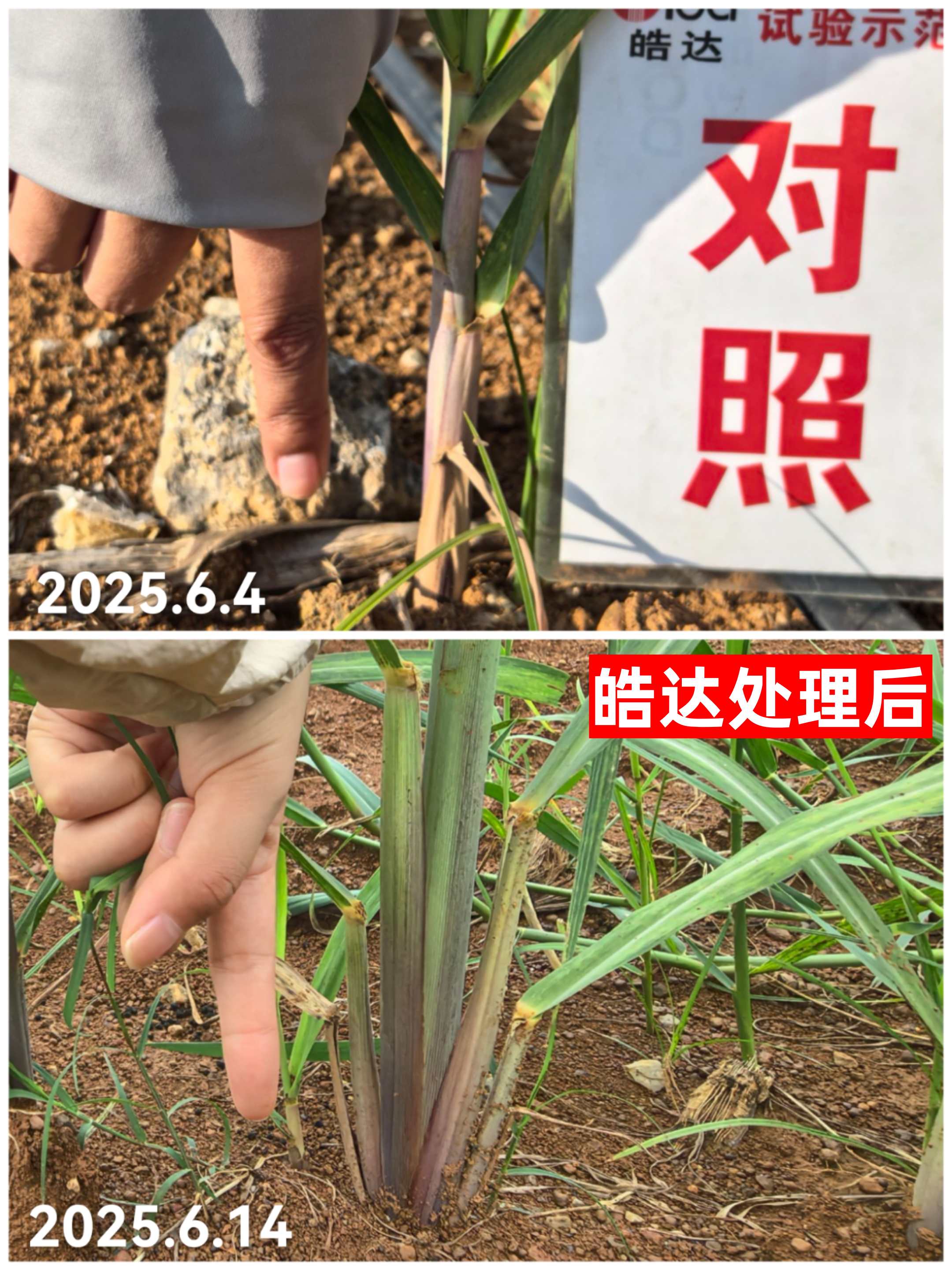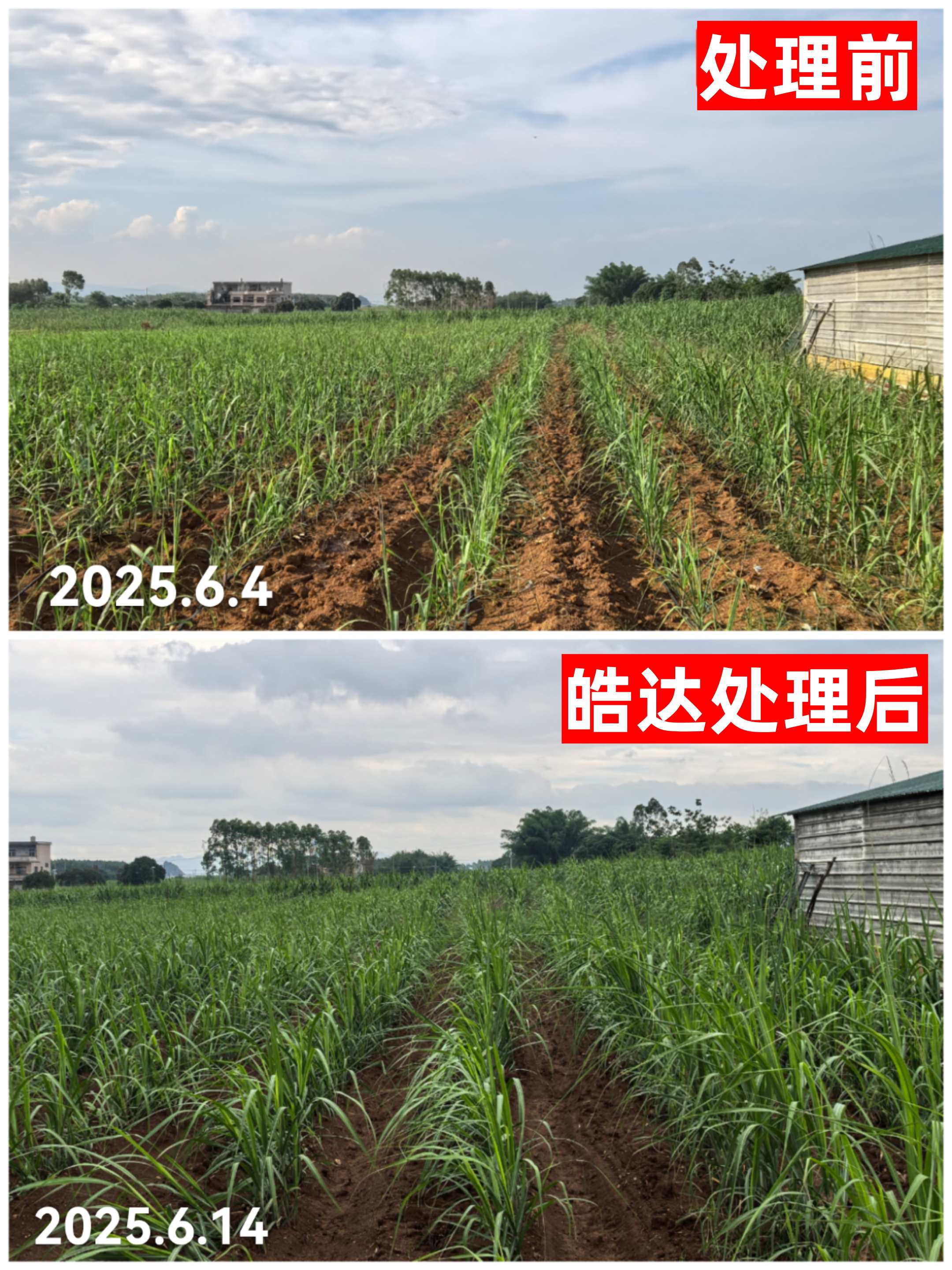 淋根3天后覃老板就看到皓達的效果十分明顯:蔗苗葉片開始轉綠,莖稈長粗,生長加快,整片甘蔗地是苗齊苗壯。