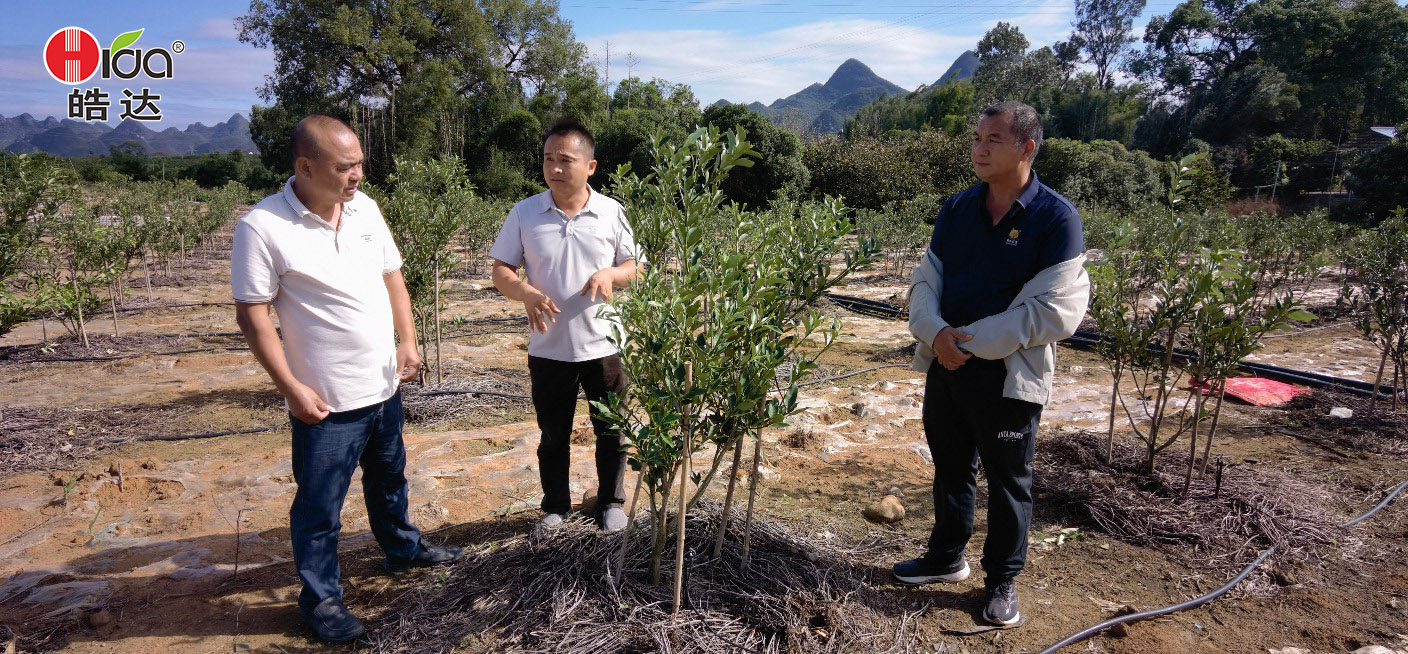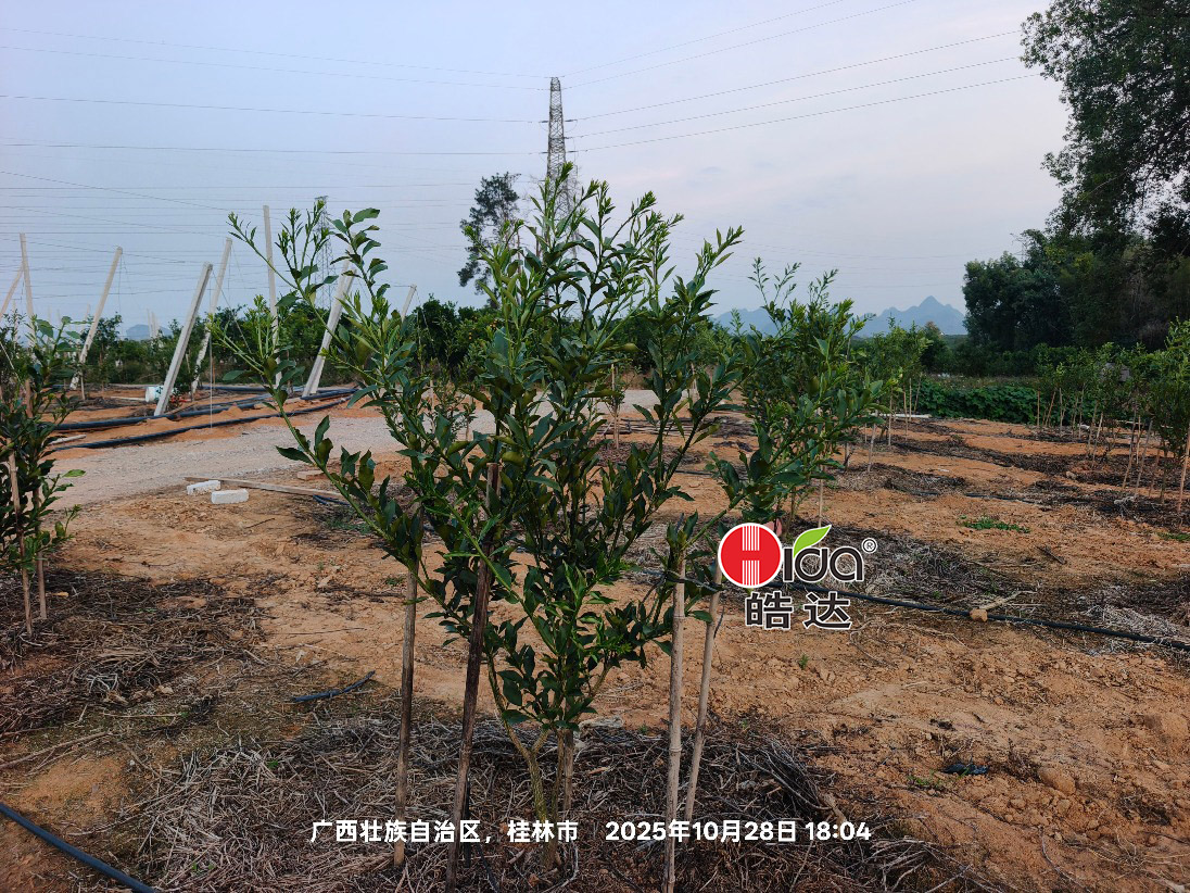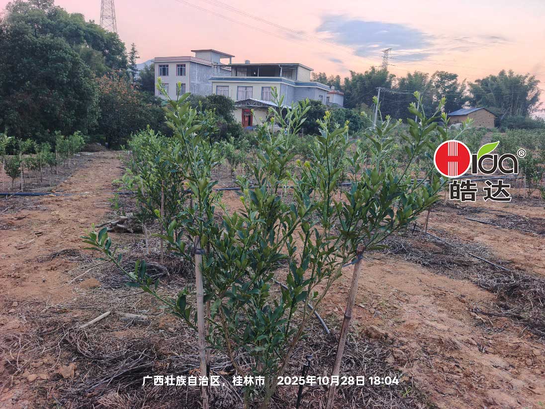 2025年10月28日我們來到廣西桂林脆蜜金桔果園回訪,該園脆蜜金柑是今年4月種植的小苗,全程使用皓達營養(yǎng)方案:皓速補100+皓達增效劑配合皓達菌劑稀釋后淋根,每次每株用量皓達20-30毫升,現(xiàn)在棵棵健壯、5次出梢整齊。