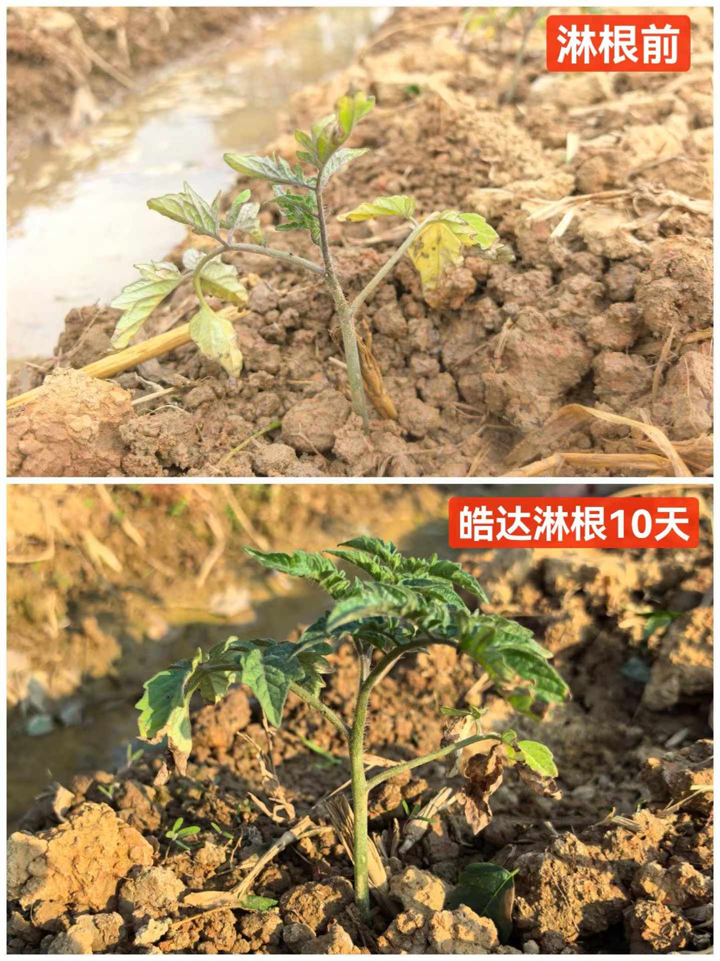 廣西桂平蒙圩鎮全老板移栽后的番茄緩苗慢、加之土壤板結、低溫霜凍造成黃苗嚴重,于2025年11月30日使用皓達300倍液定根水,12月9日(施用皓達定根水10天)回訪番茄緩苗成功、長勢興旺。
